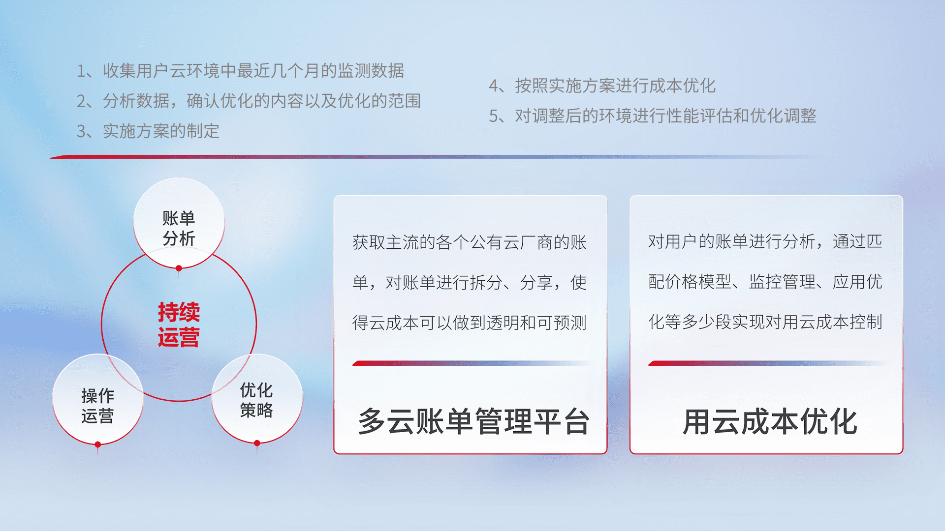 通过多云纳管,,,以统一的资源数据模型把客户的云资源进行抽象和封装,,,,进而实现对多云资源的统一操作,,,保障云资源管理的可靠性、、稳定性与可用性。。。。量身定制化运维内容,,,配置、、开发运维、、补丁管理、、备份、、、监控、、认证和访问管理、、、、审计和日常巡检等,,,保障在用云过程中的可靠度,,,稳定度以及高可用率。。。