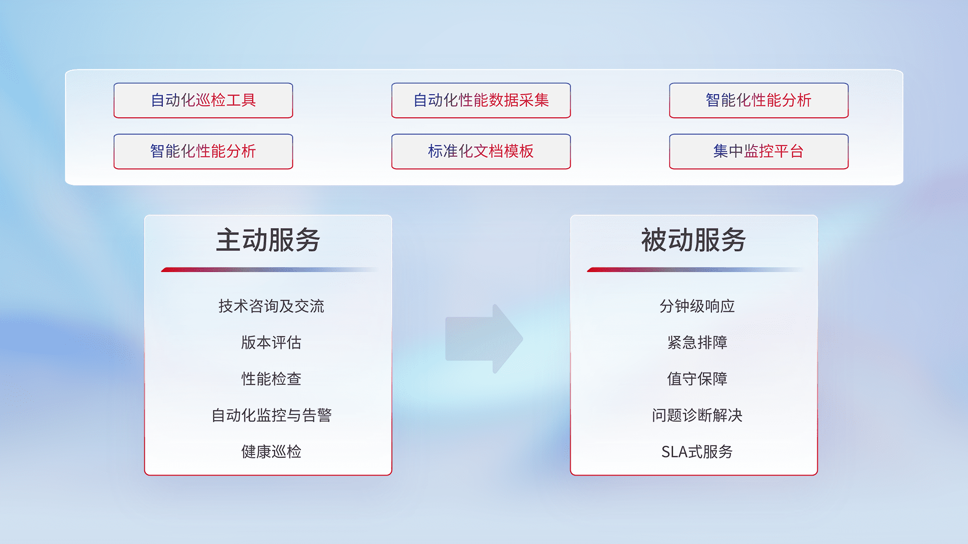 智能化工具和标准化文档,,,保障服务质量,,提供主动服务(包含技术咨询、、版本评估、、、、性能检查、、、自动化监控与告警、、健康巡检)和被动服务包含(分钟级响应、、、紧急排障、、值守保障、、、问题诊断解决、、SLA服务)。。。
